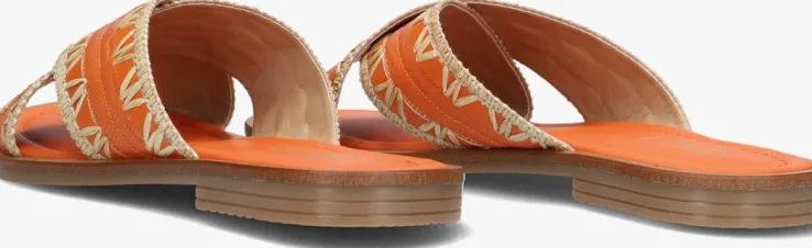 Stap in stijl met deze oranje slippers van NOTRE-V. De twee gekruiste banden bestaan uit leatherlook met een print van papierstro. De voering bestaat uit leer en het voetbed heeft een comfortabele demping. De houtlook zool maakt dit model helemaal af! Maak je outfit compleet met deze trendy slippers en straal de hele zomer door!
