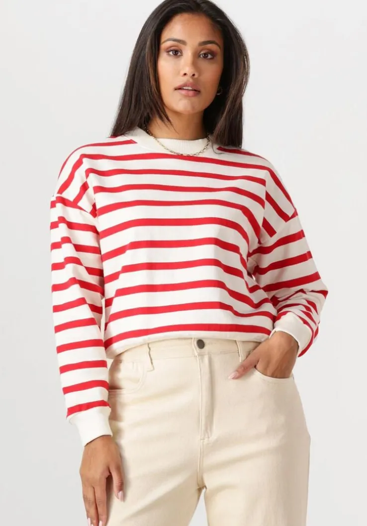 Voeg een vleugje kleur toe aan je garderobe met de Estella Sweat van Minus. Deze rood met wit gestreepte trui is perfect voor dames die houden van comfort en stijl. Ideaal voor een ontspannen dagje thuis of een gezellige brunch met vriendinnen. De zachte stof en losse pasvorm zorgen voor een heerlijk draagcomfort. Combineer de Estella Sweat moeiteloos met een strakke jeans of een stijlvolle rok voor een complete look. De opvallende rode kleur maakt elke outfit net dat beetje specialer. Laat je inspireren door de veelzijdigheid van deze trui en geniet van de complimenten die je zult ontvangen.