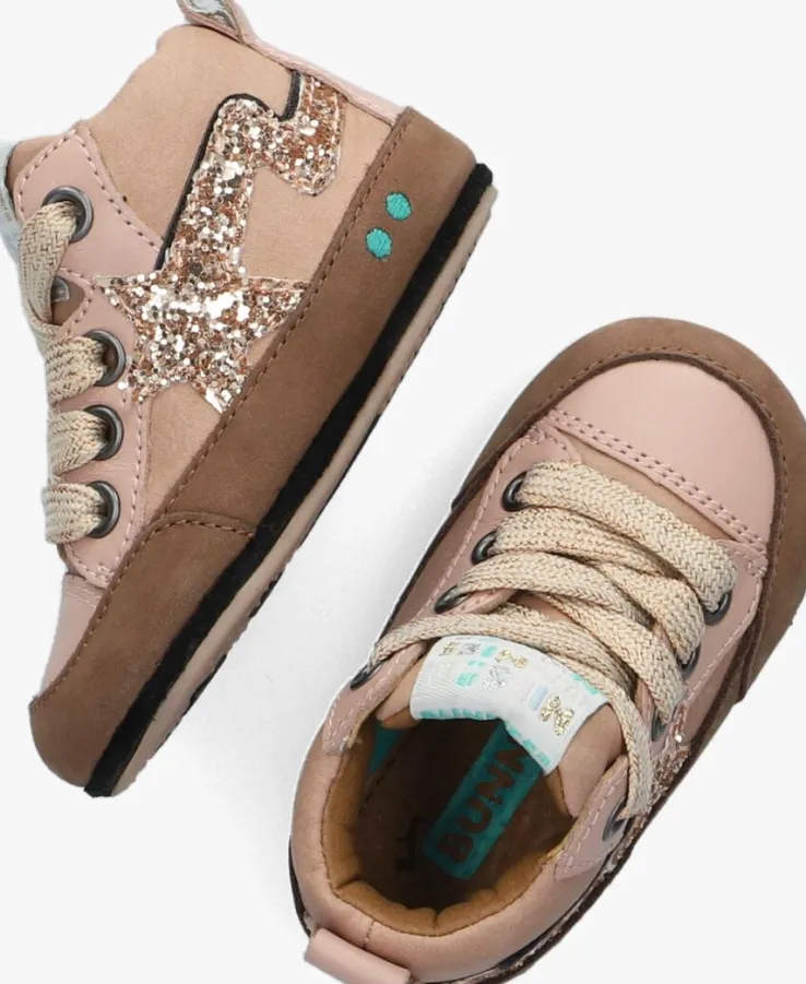 Daar gaat je kleine meid, ze zet haar eerste stapjes of begint te staan! Tijd om nu haar allereerste schoentjes uit te zoeken. Naast dat ze er natuurlijk heel leuk uit moeten zien, moeten ze ook flexibel zijn en een goede steun en grip geven. Dit hoge sneaker modelZUSJEZACHT van hetNederlandse merk Bunnies JR heeft het allemaal. Ze zien er gaaf uit dankzij de zacht roze buitenkant van nubuckleer met metallic roze glitter accenten. Aan de hiel vind je dekenmerkende Bunnies stippen en een hielbandje met aantreklusje en de tongheeft een bijpassend merklabel. Extra leuk is de ster applicatie op de zijkant en de subtiele glitters op de veters. De voering is gemaakt van leer en heeft een uitneembaar voetbed. Het rubberen super flexibele zooltje buigt mee met het voetje voor een goede afwikkeling én ontwikkeling van het voetje en heeft een anti-slip profiel. Met deze toffe schoentjes is je kindje helemaal klaar voor deze nieuwe spannende fase!