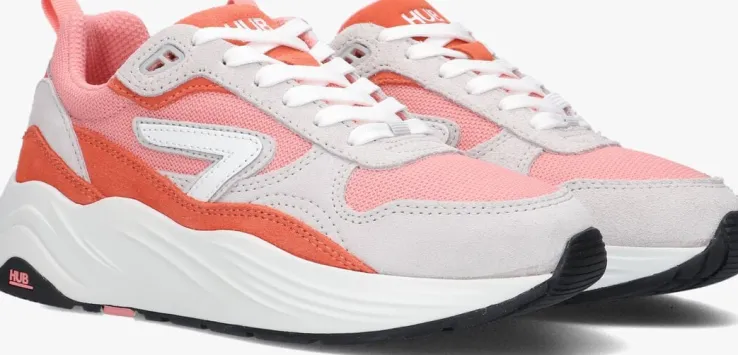 De GLIDE-Z is het nieuwste ontwerp uit de collectie van het merk HUB. Het is met recht de perfecte sneaker om mee te doen aan de chunky sneaker trend op een coole, maar vrouwelijke manier. De sneaker GLIDE-Z is gemaakt van roze mesh textiel met verschillende overlays van lichtgrijs en oranje suède en natuurlijk een rubberen oversized zool. Deze zool is niet alleen heel flexibel maar ook ultralicht van gewicht envoorzien van golvende lijnen en een merklabel op de zijkant van wit leer. Het binnenwerk is gemaakt van zacht mesh textiel en het uitneembare voetbed met gelvulling zorgt gegarandeerd voor het gevoel dat je op kussentjes loopt. Daarnaast heeft het voetbed het zogenaamde Air Flow-ventilatiesysteem zodat jouw voeten altijd droog en fris blijven. En uiteraard zorgt het profiel in de zool voor een uitstekende grip. De merkopdrukken zijn te vinden op de tong, zijkant en hiel. Wordt dit jouw nieuwe favoriete chunky sneaker?