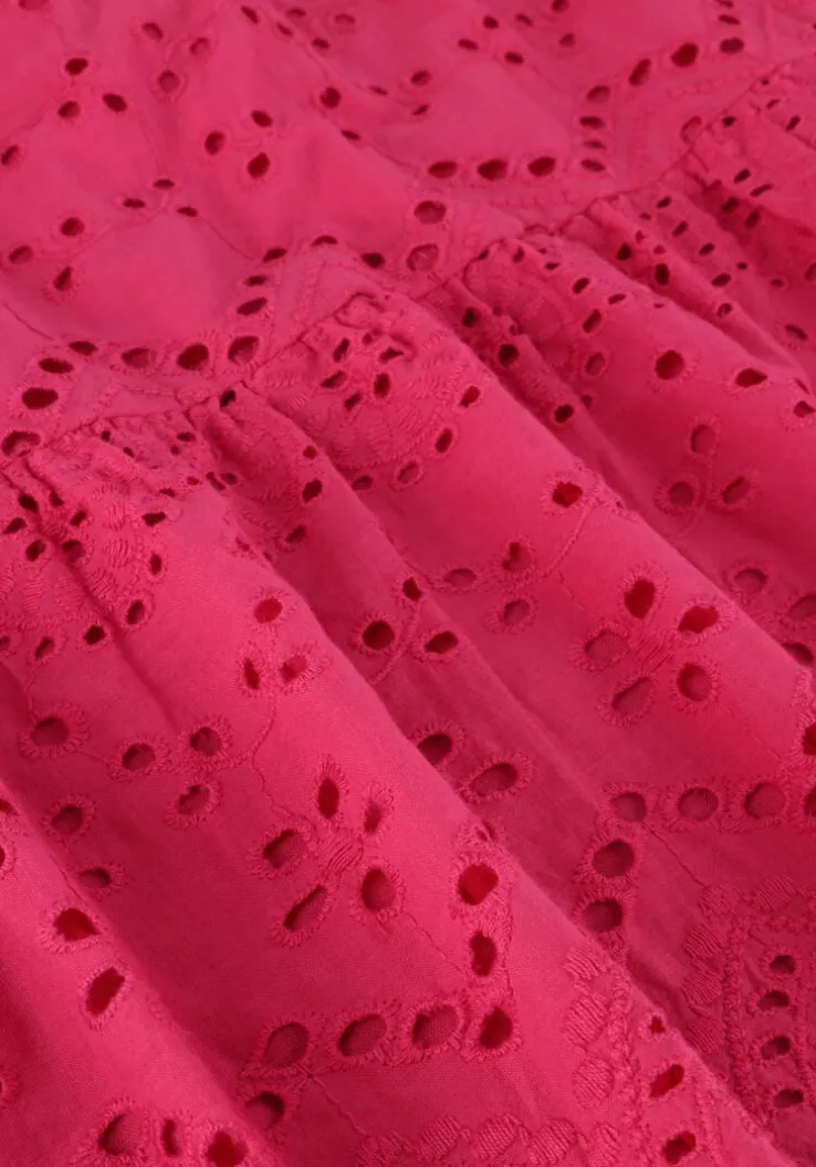 Met de NV-DONNA DRESS BRODERIE ANGLAISE DRESS van NOTRE-V ben jij helemaal klaar voor de zomer! Deze roze mini jurk is gemaakt van katoen en heeft een prachtig broderie print. De V-hals en de pofmouw maakt dit model helemaal af! Draag deze jurk tijdens een gezellige picknick in het park of een dagje shoppen met vriendinnen. Combineer de jurk met een paar trendy sandalen en een leuke hoed voor een complete zomerse look. Deze jurk past perfect bij een casual outfit, maar kan ook gecombineerd worden met cowboylaarzen voor een stoerdere uitstraling. Met dit item straal jij altijd stijl en vrouwelijkheid uit!