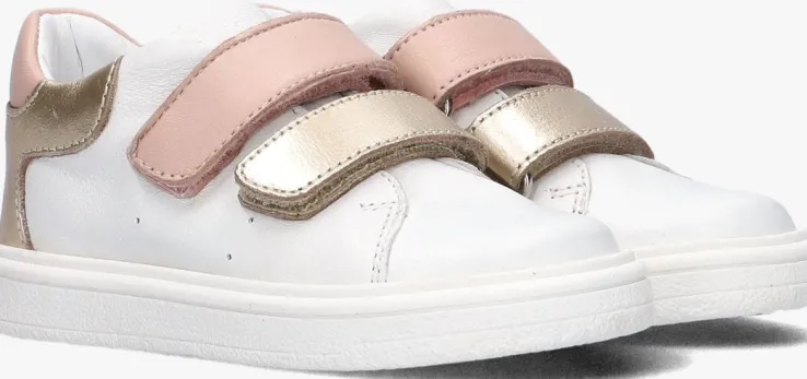 Deze lage sneaker F1041 van PINOCCHIO is gemaakt van wit leer en is voorzien van roze en goudkleurig leer op de klittenbandsluitingen en hielcap. Op de tong bevindt zich een subtiel merkreliëf en de zijkant heeft perforaties. De voering is gemaakt van leer en het voetbed is uitneembaar. De rubberen zool met zigzag profiel heeft een goede grip.