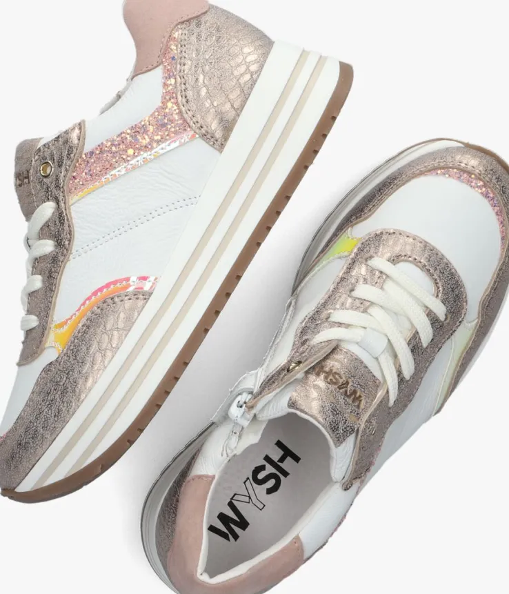 Hétnieuweschoenenmerkvoor coole kids, WYSH, staat voorWearYourSHoesen is vooreigenwijze types diehuneigenstijl volgen.Oftewel, doe je ding! Draagopieder momentde schoenen die jij wil,opiederemanierdiejijtofvindt.De trendy modellen zijn uitgevoerd in hoogwaardige materialen en zijn met zorg ontworpen voor snel groeiende voeten. Deze platformsneaker WENDY B is helemaal volgens de laatste trends. De buitenkant is gemaakt van wit leer in combinatie met panelen van metallic roségoudkleurige panelen met een dierenprintje. De hielkap is uitgevoerd in oudroze suède en de zijkant is gesierd met een roze glitterinzet en een paneel met holografische glans. Het binnenwerk heeft een leren voering en een uitneembaar voetbed. De dikke rubberen zool valt op door de accentstrepen en de amberbruine loopzool heeft een gripvast vigraatprofiel. Geef je outfit een trendy touch met deze toffe sneakers!