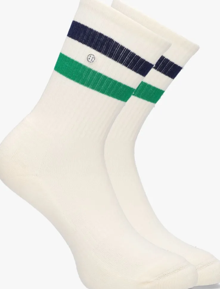 Kwaliteit, stijl enauthenticiteit:dat zijn de kernwaarden van het merk AlfredoGonzales. Als je naar de mooie producten uit de collectie kijkt, zie je dat er geen enkele moeite bespaard is gebleven bij het maken van creatieve sokken. Deze crèmekleurige sok ATHLETIC STRIPES met een blauwe en groene streep is gemaakt van 78% katoen, 18% nylon en 4% lycra. Daarnaast is elk paar AlfredoGonzales-sokken voorzien van een trademarkbutton, waardoor ze herkenbaar zijn én een leuk detail hebben als toevoeging aan iedere outfit.