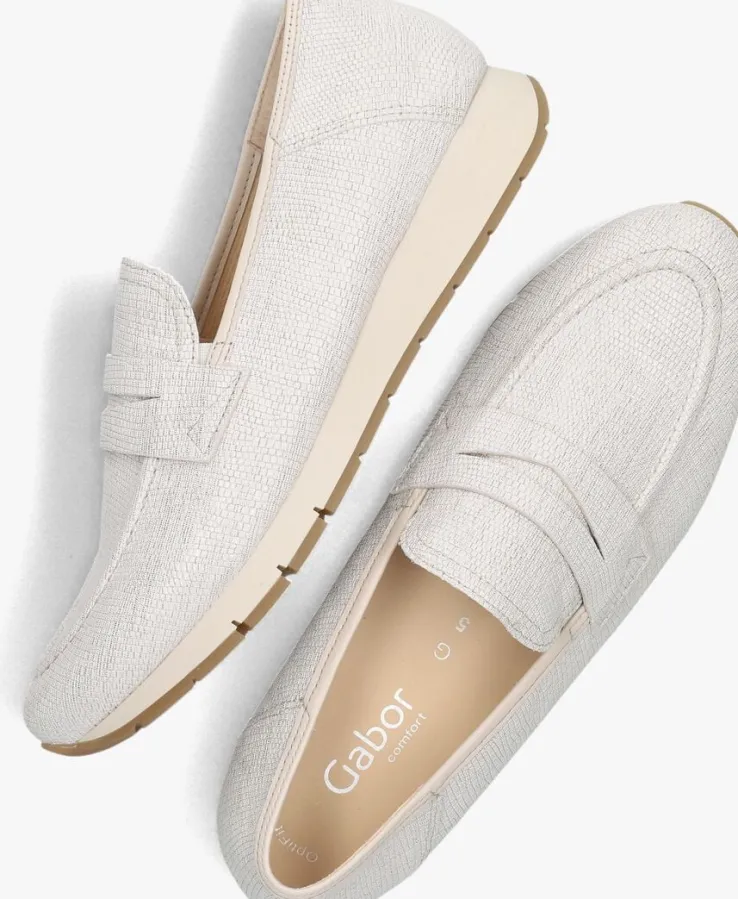 Stap in stijl met deze witte instappers van GABOR. Het bovenwerk bestaat uit wit leer met een mooie structuur en een subtiele glitter. De leren binnenkant zorgt voor een luxe gevoel en maakt ze ideaal om te combineren met een zomerse jurk of een casual jeans. Met de 471.11 ben je altijd on-trend en klaar voor elke gelegenheid.