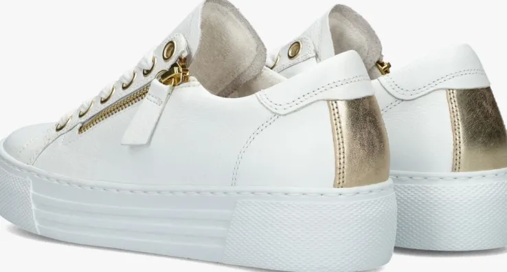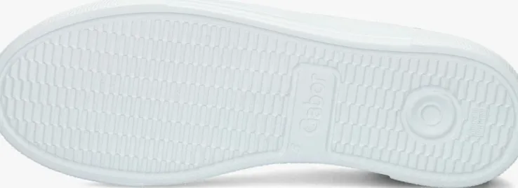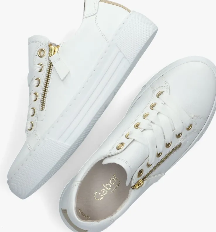 Deze witte lage sneaker 465komt uit de Comfort collectie van het merk GABOR. Comfort schoenen hebben meer volume bij de tenen en bij de bal van de voet en bieden voor iedere voet de noodzakelijke ruimte. Dit model is uitgevoerd in leer en is afgewerkt met goudkleurigeaccenten, de rits, de metalen veter ringentjes en het inzet stuk op de hiel. De binnenvoering is een combinatie van suède en badstof en het voetbed is uitneembaar. Met de handige ritslangs de veterklep trek je ‘m makkelijk aan en uit. De schoen heeft een plateau zool van 4 centimeter dik met een gestreept reliëf op de zijkant en stootranden van reliëf rondom de neus en hiel. Dit model is gemakkelijk te combineren met een stoere jeans.