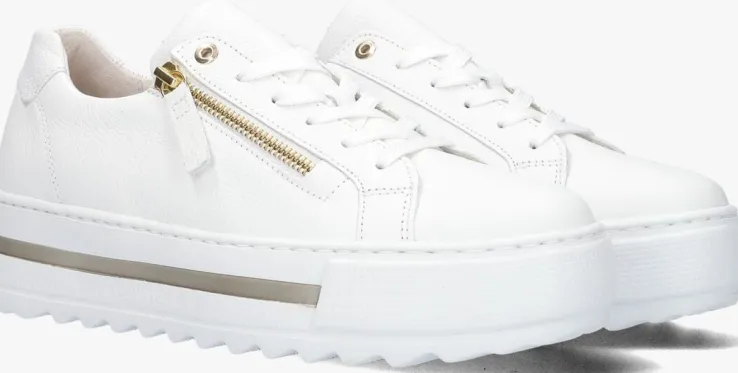 Deze witte lage sneaker 498komt uit de Comfort collectie van het merk Gabor. Comfort schoenen hebben meer volume bij de tenen en bij de bal van de voet en bieden voor iedere voet de noodzakelijke ruimte. Dit model is uitgevoerd in wit leer met een sportieve rubberen lichtgewicht zool van zo’n 4 cm dik en een opvallende goudkleurige accentstreep. De binnenvoering is een combinatie van leer en textiel en het voetbed is uitneembaar. Met de handige ritslangs de veterklep trek je ‘m makkelijk aan en uit. Dit model heeft een normaleG-wijdte. De zool heeft een grof ribbel profiel en zorgt voor extra grip.