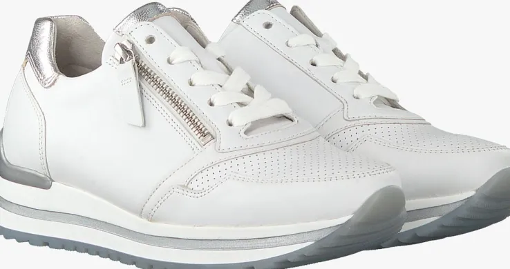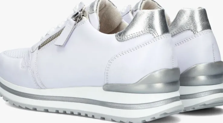Deze wittelage sneaker 528komt uit de Comfort collectie van het merk Gabor. Comfort schoenen hebben meer volume bij de tenen en bij de bal van de voet en bieden voor iedere voet de noodzakelijke ruimte. Dit model is uitgevoerd in soepel leer en is afgewerkt met metallic zilverenpanelen. De binnenvoering is een combinatie van leer en textiel en het voetbed is uitneembaar. Met de handige rits langs de veterklep trek je ‘m makkelijk aan en uit. De rubberen inzet op de hiel heeft een verstevigende werkingen de minuscule perforaties op de neus zorgen voor extra ventilatie. Dit model heeft een bredere H-wijdte en een dikke zool met metallic zilveren accentstreep. De zool is 2 centimeter dik onder de voorvoet en loopt naar achteren toe op tot een hakhoogte van 4 centimeter. Het grove ribbelprofiel in de loopzool biedt veel grip en stabiliteit. Een fijne sneaker met veel comfort maar ook nog eens heel fashionable!