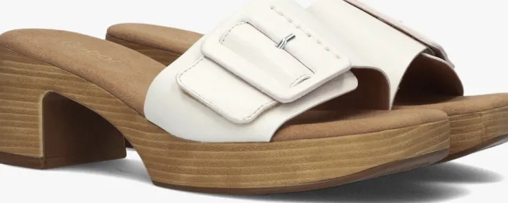Deze muiltjes 722.3 zijn super trendy voor de zomer! Dit witte model komt uit de collectie van het merk GABOR en heeft een bovenwerk van leer met een beklede siergesp. Onder de gesp zit klittenband bevestigd, zodat hij goed aansluit aan je voet. De voering bestaat uit suèdelook en heeft een dempend voetbed. De houtlook zool maakt dit model helemaal af en het plateau onder de voorvoet is 2,5 centimeter hoog. De hakhoogte is 6 centimeter en is afgewerkt met een kunststof haktip. Dit muiltje staat je altijd goed!