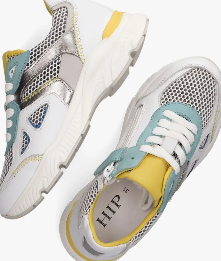 Het merk HIP heeft niet voor niks het woord ‘hip’ als merknaam. Met de schoenen uit de collectie van dit merk ben jij gegarandeerd van een hippe schoen en loop je er altijd trendy bij. Deze witte lage sneaker H1682 is uitgevoerd in wit leer met grof mesh en gele, blauwe en zilverkleurige accenten. Ook heeft hij een chunky zool die, zoals je wellicht wel weet, ook dit seizoen weer een ware musthave is! Op de zijkant is een toffe zilverkleurige inzet te vinden van leer met gele zigzagstiksels, de veterklep is gesierd met blauw nubuckleer en de gele hielstabilisator en merklabel op de tong vallen goed op. Dankzij de ritssluiting naast de vetersluiting trek je ‘m gemakkelijk aan en uit. Voor een stoere look is dit model afgewerkt met een rubberen chunky zool met toffe vormen. Het binnenwerk is gevoerd met leer en heeft een uitneembaar voetbed. De zool is voorzien van een gripvast profiel voor een goede grip.