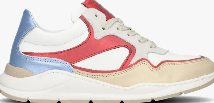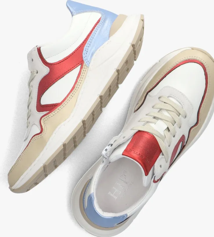 Het merk HIP heeft niet voor niks het woord ‘hip’ als merknaam. Met de schoenen uit de collectie van dit merk ben jij gegarandeerd van een hippe schoen en loop je er altijd trendy bij. Deze witte lage sneaker H6355 is uitgevoerd in wit leer met overlays van beige, rood en blauw leer met een metallic glans. Opvallend is het merklabel op de tong en de rubberen accenten op de hiel. Dankzij de ritssluiting naast de vetersluiting trek je ‘m gemakkelijk aan en uit. Voor een stoere look is dit model afgewerkt met een rubberen chunky zool. Het binnenwerk is gevoerd met leer en heeft een vast voetbed. De zool is voorzien van een gripvast profiel voor een goede grip.