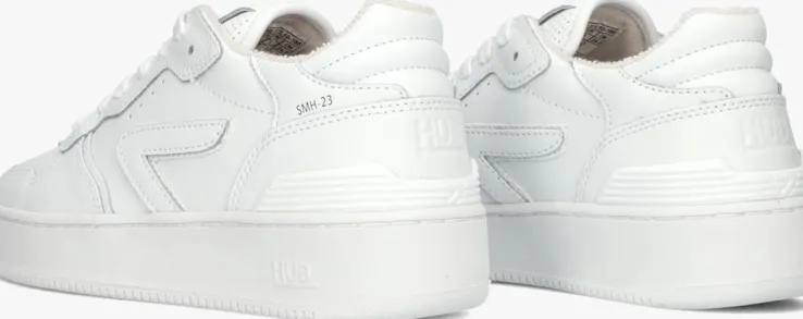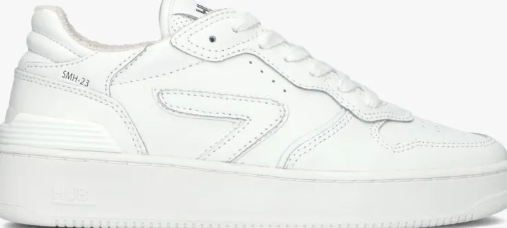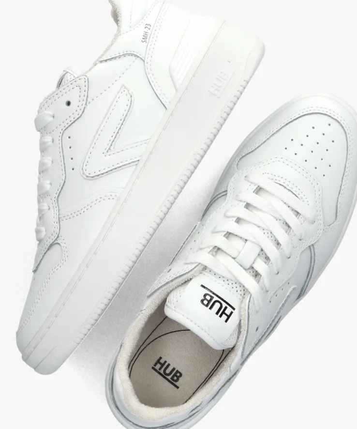 De SMASHsneakeruit de collectie van het merk HUB isop basketball-schoenen geïnspireerd en heeft een uniekontwerp en een hoog comfort. Deze witte sneaker is gemaakt van soepel leer met perforaties op de neus en tong en een toffe retro look. De rubberen kuipzool is niet alleen heel flexibel maar ook ultralicht van gewicht envoorzien van een reliëf merkopdruk. Uniek details zijn de merkopdrukken op de tong en hiel, de verstevigende hielstabilisator en het welbekende logo op de zijkant van de sneaker. Het binnenwerk is van vochtabsorberend badstof en het uitneembare voetbed met gelvulling zorgt gegarandeerd voor het gevoel dat je op kussentjes loopt. Daarnaast heeft het voetbed het zogenaamde Air Flow-ventilatiesysteem zodat jouw voeten altijd droog en fris blijven. En uiteraard zorgt het profiel in de zool voor een uitstekende grip. Wordt dit jouw nieuwe favoriete sneaker?