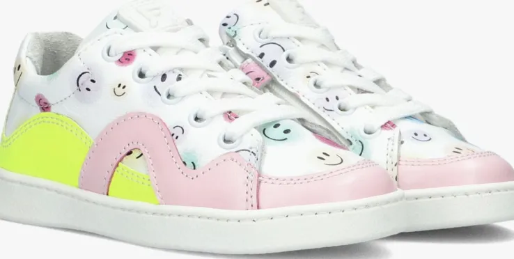 Met deze leuke lage sneakers ZOE uit de collectie van het merk JOCHIE & FREAKS ben je helemaal in de wolken. Bij het zien van deze sneakers word je spontaan vrolijk door de verschillende kleuren en blije smileys op het bovenwerk. Zo heeft de hiel een opvallende neon gele inzet die doorloopt tot op de zijkant en is de neus verstevigd met een roze paneel van leer die ook als een golvende lijn op de zijkant van de sneaker zit. De tong heeft een rubber merkembleem en over het gehele bovenwerk zitten super vrolijke smileys. Het binnenwerk is leer gevoerd en heeft een uitneembaar, dempend voetbed. Dankzij de ritssluiting naast de vetersluiting trek je ‘m gemakkelijk aan en uit en hoef je niet iedere keer de veters te strikken. Het gripvast profiel onder de rubberen zool zorgt voor een goede grip en stabiliteit.