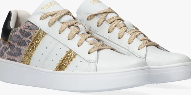 Het merk TON & TON heeft een uitgebreide collectie voor de stoere binken en de hippe meiden. Dit hippe, jonge en trendy merkzorgt ervoor dat opgroeiende kids stevige schoenen kunnen dragen welke gemaakt zijn van soepele materialen zodat kids zorgeloos kunnen ravotten. De buitenkant van deze lage sneaker ERICA is gemaakt van wit leer met een suède hielstuk met panterprint en glanzende folie, een zwart hielstuk en goudkleurige strepen en accenten aan de zijkant van de schoen. De perforaties zorgen voor die extrasportieve uitstraling. Het binnenwerk heeft een lederlook voering met een uitneembaar voetbed. Dankzij de ritssluiting naast de vetersluiting trek je ‘m gemakkelijk aan en uit. De rubberen zool is voorzien van een gripvast profiel.