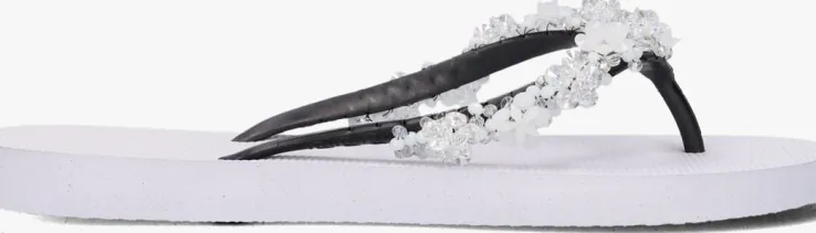 Deze witte PRECIOUS BLOOM WHITE slipper uit de collectie vanUzurii Luxury Footwear is een ware eyecatcher om al die vredige strandjes en drukke boulevards mee af te struinen! De producten van dit Nederlandse modemerk zijn stuk voor stuk handgemaakt met speciale technieken en grote toewijding. Deze luxe slipper is uitgevoerd in hoogwaardig rubber en heeftprachtige strass-stenen in de vorm van witte bloemenop de zwarte rubberen wreefband.De schoenendoos waar deze mooie slippers in worden geleverd heeft een luxe afwerking enaan ze binnenzijde voorzien van een spiegel. Na gebruik kanje ‘m dus gebruiken als handig make-up of sieradenopbergdoos.