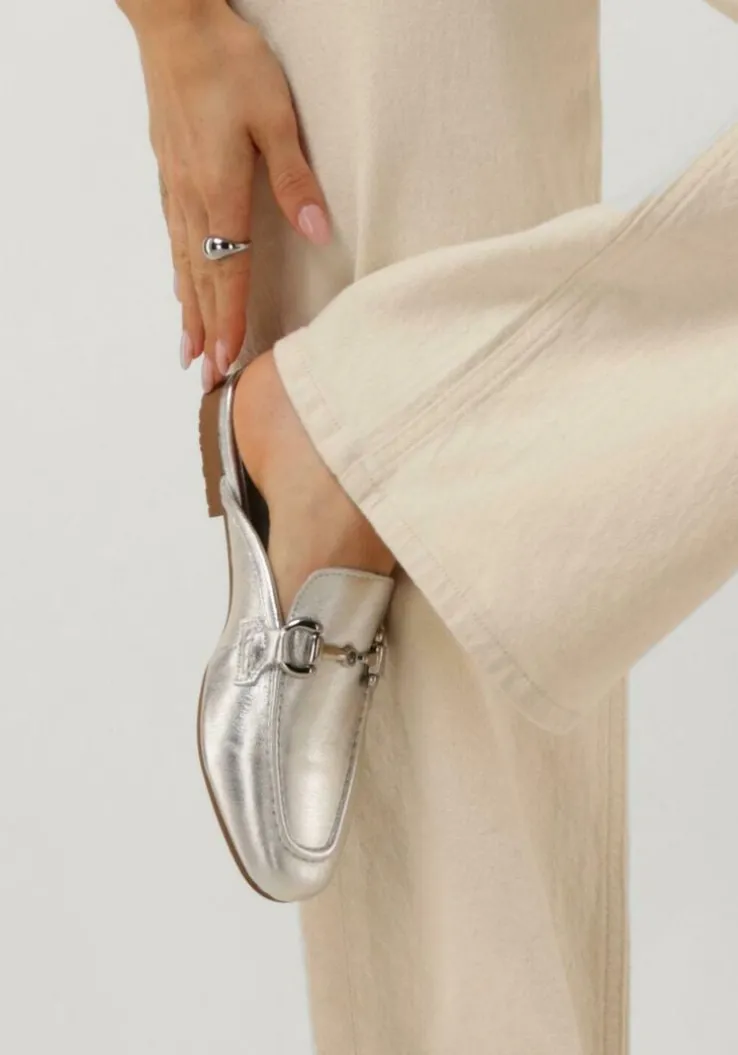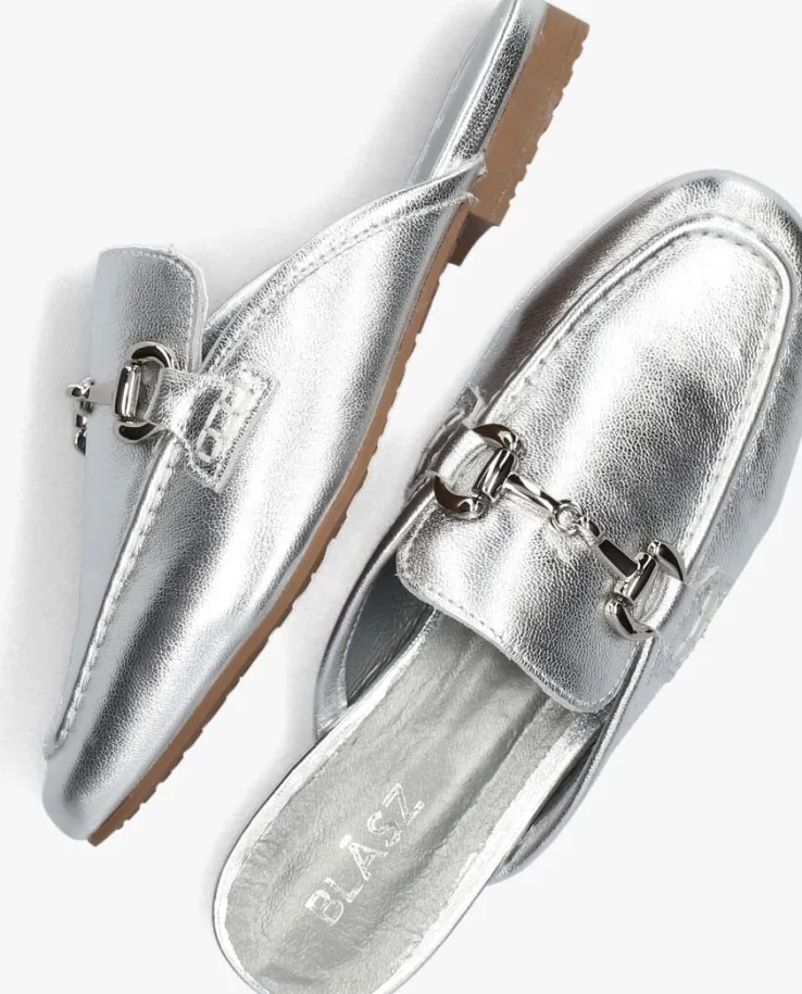 Stap in stijl met deze zilverkleurige muiltjes van BLASZ. Het bovenwerk bestaat uit zilverkleurig leer met een zilverkleurig element op de wreef. De ronde neus en het comfortabele leer aan de binnenkant maken ze perfect voor een dagje shoppen of een lunchdate met vriendinnen. Combineer ze met een lichte jeans en een witte blouse voor een casual-chique look. De rubberen zool zorgt voor grip en comfort, zodat je de hele dag moeiteloos kunt rondlopen.