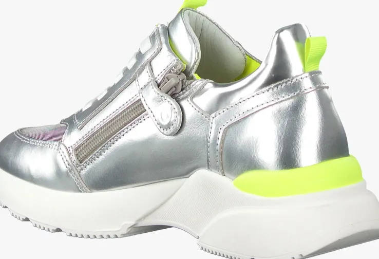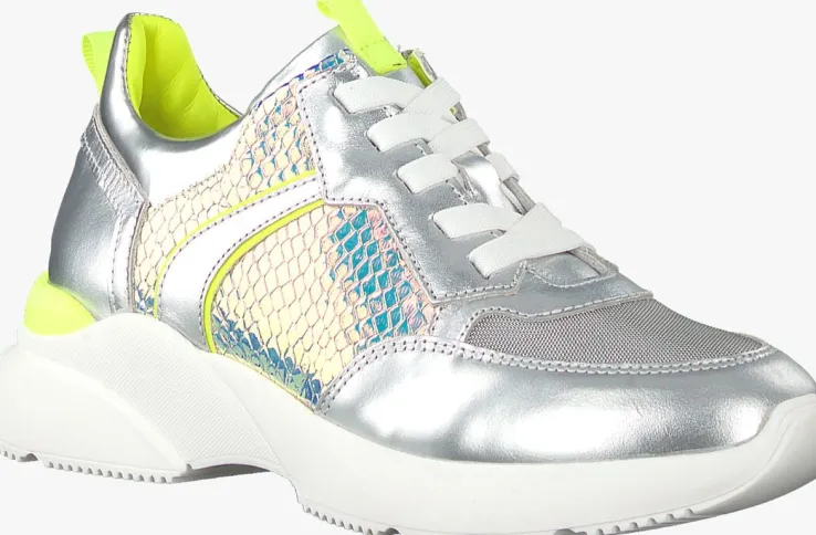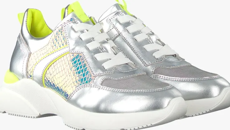Val op met deze super trendy zilverkleurige lage sneaker H1274 van het merk HIP. De buitenkant is gemaakt van zilverkleurig leer in combinatie met technisch stevig mesh, een holografisch zijpaneel met reptiel structuur en neon gele accenten. De tong en hiel zijn voorzien van een neon geel aantreklusje en zorgt samen met de ritssluiting voor veel gemak bij het aantrekken. Het binnenwerk heeft een leren voering met een uitneembaar voetbed. De rubberen zool heeft een chunky look met een neon geel hielstuk en een gripvast profiel. Ben jij al klaar voor een stoere look met deze toffe sneaker?