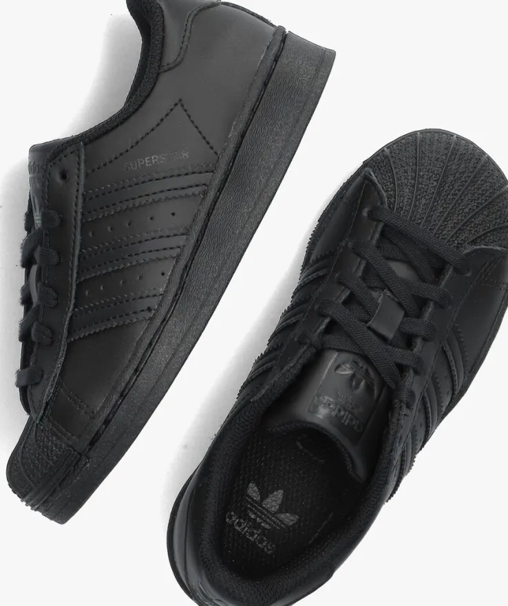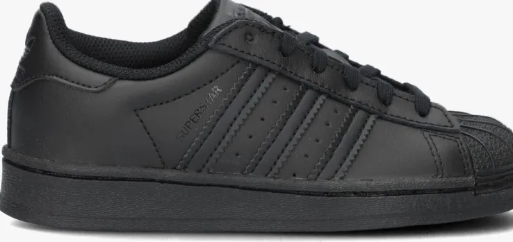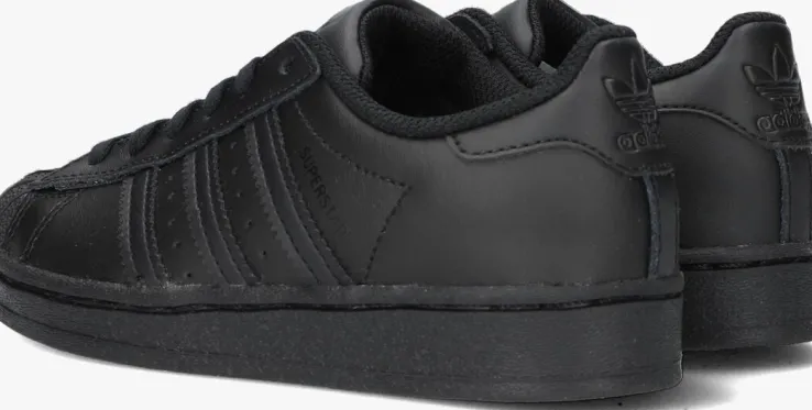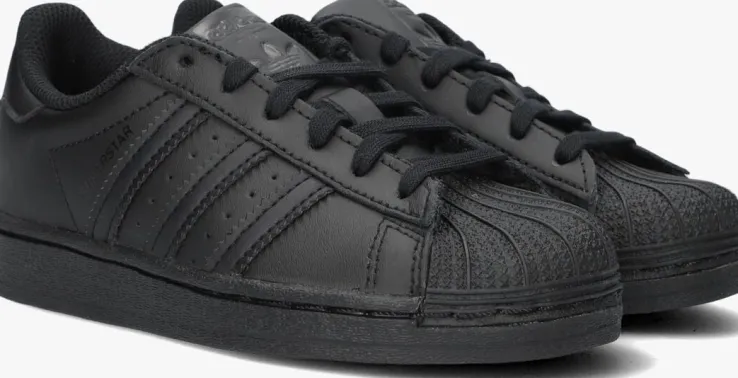 Met deze zwarte Superstar-sneaker SUPERSTAR C laat Adidas ook de jongstekennis maken met hun originals. Dit item is gevoerd met textiel en de buitenkantis van leer met lederlook details. De authentieke 3-Strips zijn gekarteld en daartussen vind je perforaties. Een ander authentiek element bij de Superstar-sneaker uit de jaren 70 is de rubberen shell-toe. Op de tong, hiel en zijkant bevindt zich een merkopdruk. De rubberen zool heeft een visgraatprofiel voor voldoende grip.