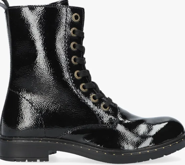 Veterboots zijn niet meer weg te denken uit het straatbeeld en er is genoeg keuze. Deze toffe veterboot B0010451 komt uit de collectie van het merk APPLES & PEARS en heeft een zwart bovenwerk van lakleer. Opvallend zijn de metalen veterringen, de goudkleurig stippen op de zoolrand en de handige aantreklus op de schacht. Het binnenwerk heeft een superzachte en warme textiel voering met een vast voetbed. Dit model heeft naast een vetersluiting ook een ritssluiting waardoor je veel gemak ervaart tijdens het aan- en uittrekken. Het grove profiel onder de rubberen zool benadrukt de stoere look en biedt veel grip en stabiliteit.