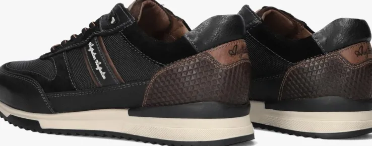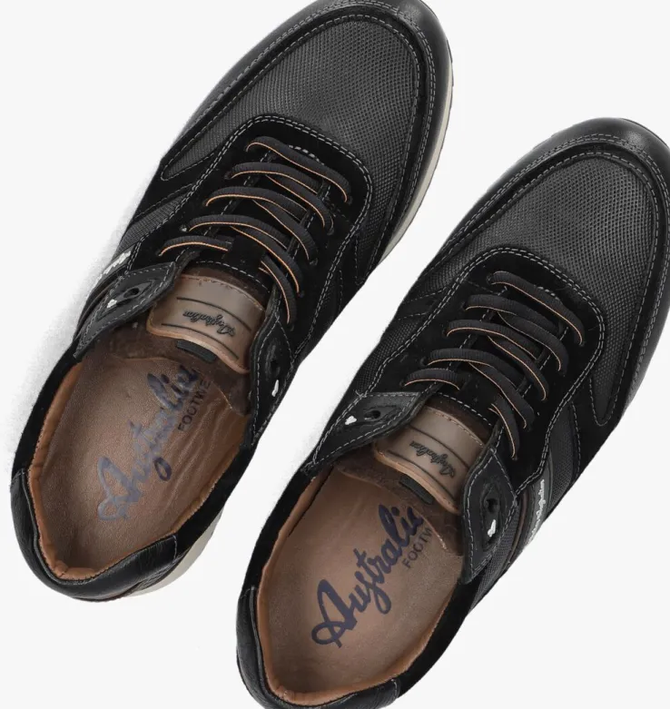 Deze lage sneaker FILMON is van het merk Australian. Dit model is gemaakt van zwart leer met suède overlays en heeft cognac kleurige met witte accenten. Het rubberen merkembleem is te vinden op de tong, zijkant en veterlus. Leuke details zijn de grijze stiksels, de cognackleurige, de hiel met driehoekreliëf en de zwarte rubberen hielstabilisator. De binnenkant is gemaakt van cognac kleurig leer in combinatie met textiel en het dempende voetbed is uitneembaar. De rubberen zool met zwarte loopzool heeft een gekarteld profiel wat zorgt voor voldoende grip, steun en stabiliteit. De perfecte sneaker voor een fijne citytrip!