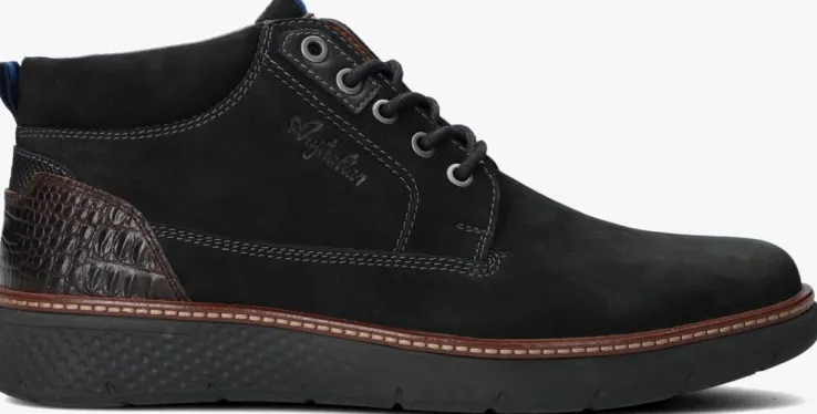Casual zwarte veterboot DEXTER met bruine accenten van het merk AUSTRALIAN. Dit model heeft een fraai bovenwerk van zacht nubuck met zilverkleurige veterringen, een cognac kleurig label van leer met merkopdruk op de tong en op de zijkant bevindt zich een reliëf merkopdruk. De hiel is voorzien van een verstevigende hielcap van bruin leer met krokodillen print en een handige aantreklus van textiel met blauwe accentstrepen, deze is ook terug te zien op de tong. Het binnenwerk is van zacht cognac kleurig leer en heeft een uitneembaar voetbed. De enkelkraag is opgevuld en biedt veel ondersteuning en comfort. Ook de sportieve zool met profiel van opgedeelde vlakken zorgt voor een comfortabel loopcomfort en een uitstekende grip. De perfecte sneaker voor een fijne citytrip! Een extra leuk detail aan deze schoen is de lederen sierrand met goudkleurig stiksel die de schoen net even wat chiquer maakt.