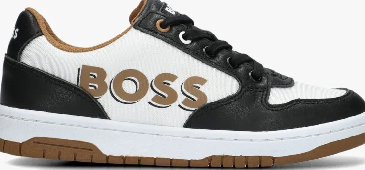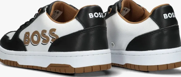 Stap in stijl met de BOSS KIDS BASKETS J50861 lage sneakers in het zwart. Deze stoere schoenen zijn perfect voor jongens die op zoek zijn naar comfort en een trendy uitstraling. Dit model is uitgevoerd in zwart leer in combinatie met wit mesh textiel. Opvallende details zijn de veteringen in de kleur zwart, wit en bruin, de kleine perforaties op de tong, en het merklogo op de zijkant die ook terug te vinden is op de tong en hiel. De binnenvoering is gemaakt van bruin textiel en heeft een uitneembaar voetbed van leer. De witte zool is gemaakt van rubber en heeft een gripvast profiel. Of je nu naar school gaat of met vrienden hangt, met deze sneakers ben je altijd on-point. Laat jezelf zien en rock die BOSS KIDS sneakers!