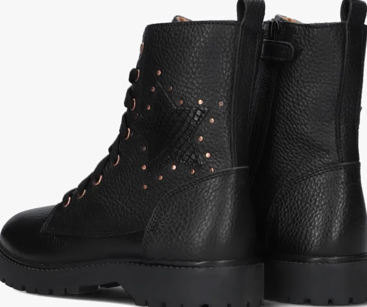 Ontmoet de BETTY BOOT, de perfecte veterboots voor stoere meisjes! Deze zwarte boots zijn gemaakt van hoogwaardig leer en hebben bronskleurige accenten. Met hun chunky zool geven ze elke outfit een trendy touch. Het uitneembare voetbed zorgt voor extra comfort, terwijl de schachthoogte van 16 centimeter zorgt voor een stoere look. Dankzij de handige rits zijn ze gemakkelijk aan en uit te trekken. Op de zijkant prijkt een ster met een omtrek van mini bollstuds. De rubberen zool biedt goede grip en stabiliteit. Combineer deze schoenen met een jeans en een oversized trui voor een coole en casual look. Of draag ze onder een jurkje voor een edgy twist. Met deze boots ben je klaar voor elke avontuurlijke dag!