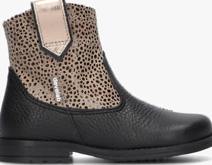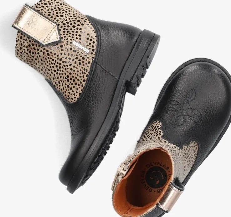 Ook dit seizoen loopt jouw kleine meid er weer super trendy bij met deze enkellaarsjes 42800 van DEVELAB. Dit model heeft een bovenwerk van zwart structuurleer met een schacht van beige leer dat is voorzien van een zwarte pixelprint. Dit model heeft echte cowboy-accenten, zoals de stiksels op de voorvoet, de afgeronde schacht en de goudkleurige aantreklus aan de bovenzijde. Op de zijkant prijkt een rubber merklabel. Je kleine meid trekt dit model razendsnel aan door de ritssluiting aan de binnenzijde. De voering bestaat uit bruin leer en heeft een uitneembaar voetbed. De rubberen zool heeft een gripvast profiel.