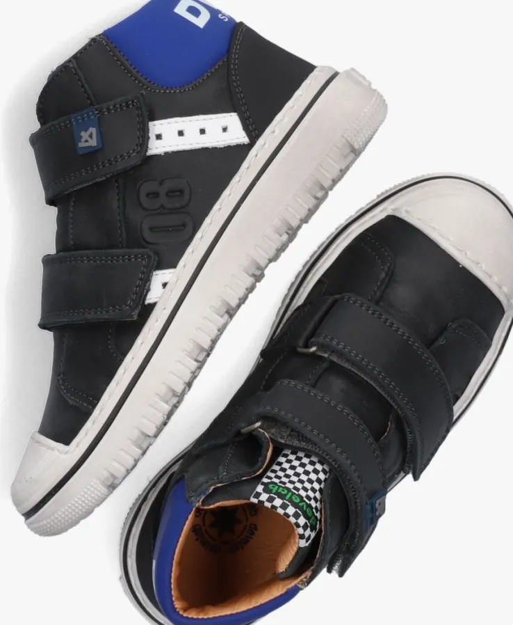 Stoere hoge sneakers zijn een musthave voor alle stoere jochies. Ga voor dit toffe model 41927 uit de collectie van het merk DEVELAB. De buitenkant is gemaakt van zwart leer en heeft een rubberen afwerking op de neus waardoor de neus veel minder snel slijt en de schoen langer mooi blijft ondanks al die klim en klauter avonturen. De enkelkraag is afgewerkt met een blauwe inzet met witte merkopdruk en in combinatie met het textiele merklabel op de tong geeft dit je een stoere look. De binnenkant heeft een leren voering met een uitneembaar voetbed die comfortabel aanvoelt bij groeiende voetjes. Met de dubbele klittenband sluitingen kan je zoontje heel gemakkelijk zelf de sneaker aan-en uittrekken. Extra leuk detail is de witte rubberen zool die een used look heeft gekregen en de zwarte accentstreep die de stoere look benadrukt.