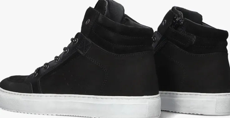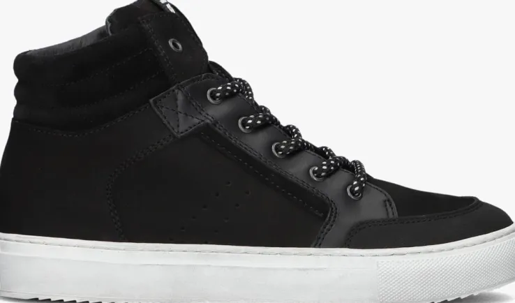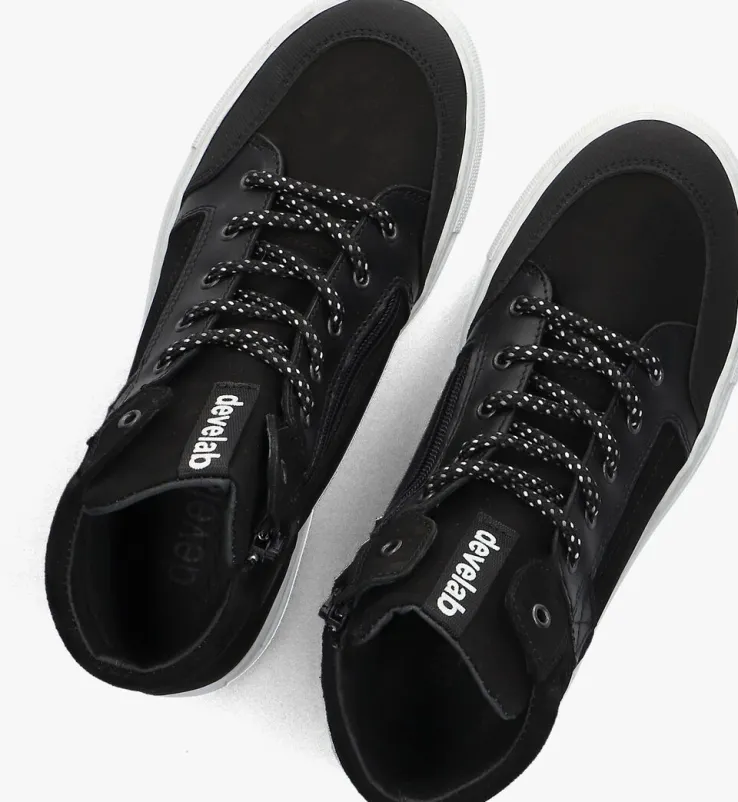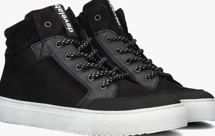 Maak kennis met de 45205 hoge sneakers voor jongens. Deze stoere sneakers in zwart nubuck zijn perfect voor een dagje uit of een middagje skaten. De sneakers hebben een suède kraag en kleine perforaties aan de zijkant. De ronde neus en vetersluiting zorgen voor een comfortabele pasvorm, terwijl de leren binnenkant je voeten fris houdt. De witte rubberen zool biedt grip en duurzaamheid, ideaal voor actieve avonturen. Combineer deze sneakers met een jeans en een casual T-shirt voor een coole, alledaagse look. Of draag ze met een sportieve jogger en hoodie voor een relaxte stijl. Met de 45205 sneakers van DEVELAB ben je altijd klaar voor actie.