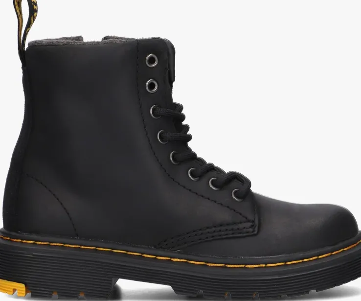 Je bent de grootste rebelop het schoolplein met dezeleren miniversie van de 1460-veterboots van Dr.Martens!Deze zwarte boots 1460 K zijn gemaakt van matterend leer. Delaarzen zijnniet alleen heel stoer en opvallend, maar ook comfy én hip! De veterboots hebben de kenmerkende Dr. Martens-accenten, zoals de zoolrand met groeven, de oversized hiellus, het gele stikselrondom de schoen en de metalen veterogen. De achterkant is afgewerkt met een suèdelook bies. Dit model heeft een handige ritssluiting om ‘m gemakkelijk aan en uit te trekken. Het binnenwerk is uitgevoerd in zacht textiel en heeft een vast voetbed. De schoen is gemaakt om lang mee te gaan en heeft daarom een extraflexibele, verlijmde loopzool, zodat groeiende voeten niet worden belemmerd. Deze rubberen zool is olie- en vetbestendigen biedt een goede schuur- en slipweerstand. *Maatadvies: schoenen van Dr. Martens moeten eerst goed ingelopen worden, maar daarna wil jenooit meer zonder!