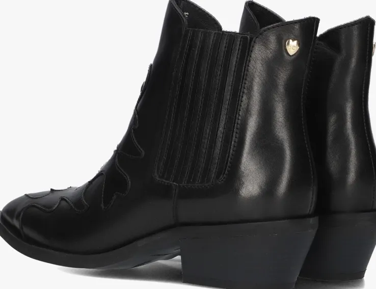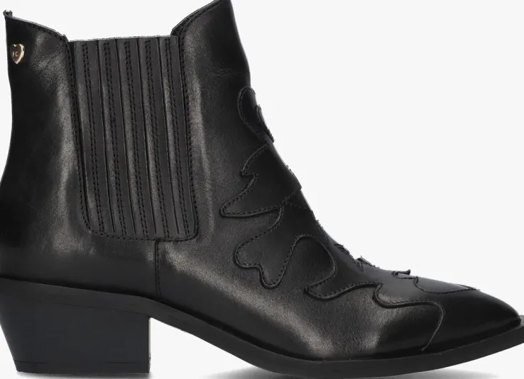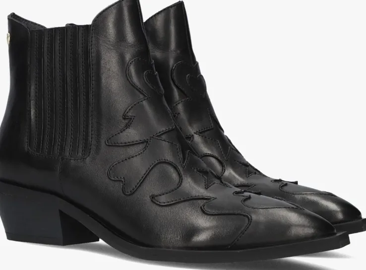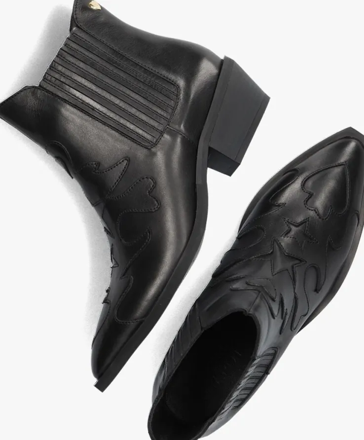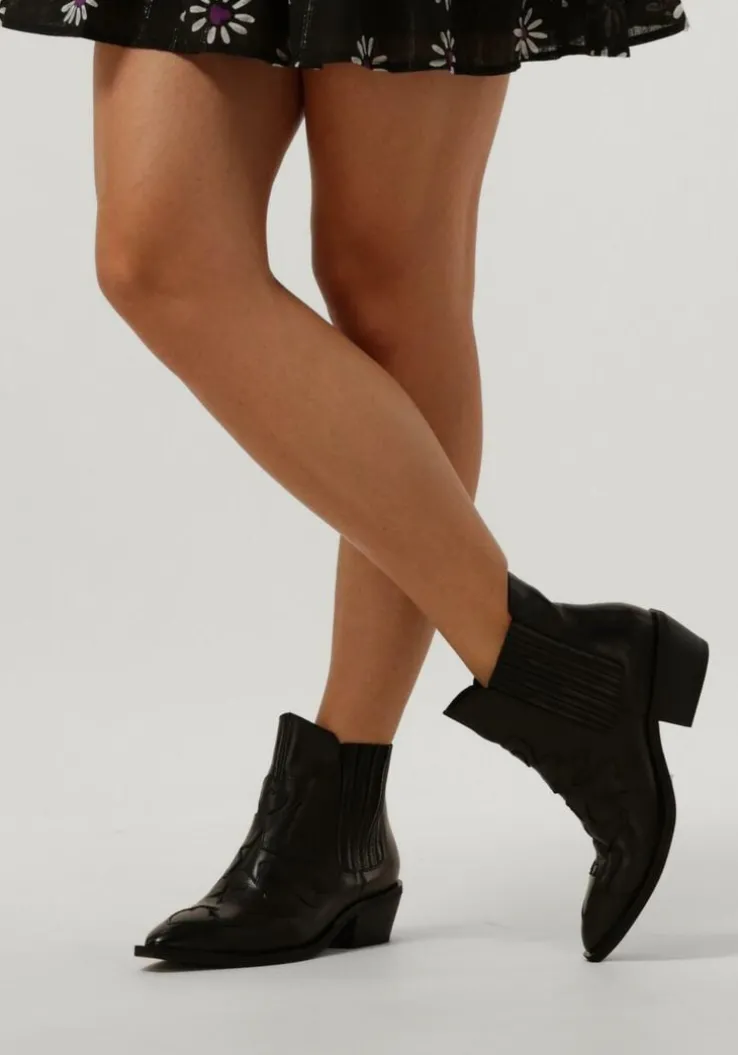 Met behulp van uitdagende collecties wil het merk Fabienne Chapot vrouwen verleiden om op te durven vallen. En dat doe je met deze enkellaars TAMMY BOOT zeker! Dit toffe model met western touch is uitgevoerd in zwart leer. Opvallend is de puntige neus met de vierkante zool die een stukje doorloopt, de speelse opgestikte vormen van leer op de neus, de merkstud op de achterkant, de gelaagde blokhak en de elastische, beklede panelen op de zijkanten voor een gemakkelijke instap en trendy touch. Het binnenwerk is van leer en heeft een vast, leren voetbed. De hakhoogte is 5 centimeter en de schachthoogte is bijna 13 centimeter (gemeten bij maat 38). Draag de enkellaarzen onder een jurk en geef je outfit een stoere touch. Of combineer deze toffe boots met een jeans en je creëert eenvoudig een trendy look!