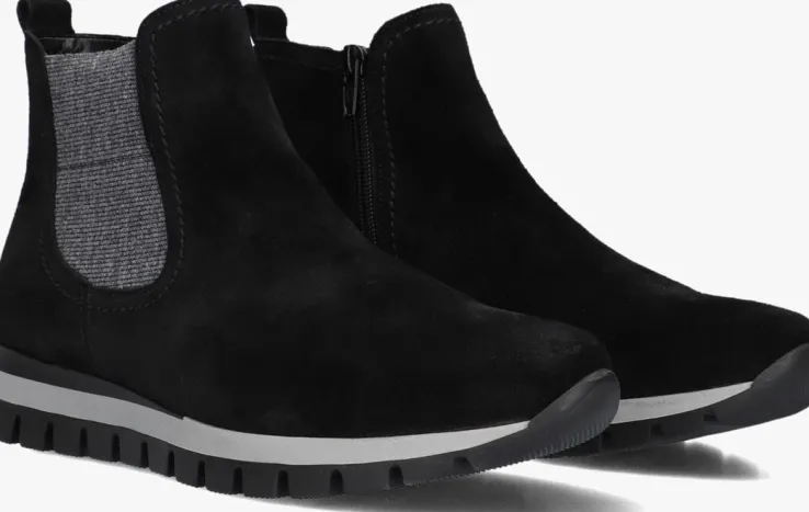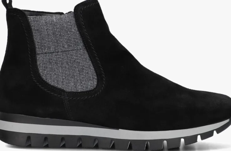 Deze chelsea boot 451 komt uit de collectie van het merk Gabor. Dit comfortabele item heeft een bovenwerk van zwart suède en een grijs elastieken inzetstuk aan de zijkant. Leuke details zijn het aantreklusje op de achterkant van de schacht, het stiksel rond de elastiek en de zwarte inzet in de zoolrand. De laars heeft een ritsje waarmee je ‘m gemakkelijk aandoet en een binnenwerk van suèdelook. Het dempende voetbed is uitneembaar en dit model heeft een H-wijdte, waardoor de schoen meer ruimte heeft in het gebied bij de bal van de voet en de wreef. De zool is onder de voorvoet ruim 2 centimeter hoog en loopt naar achteren toe op tot 3,5 centimeter. Een comfy laarsje dat je makkelijk combineert! Waar draag jij ‘m bij?