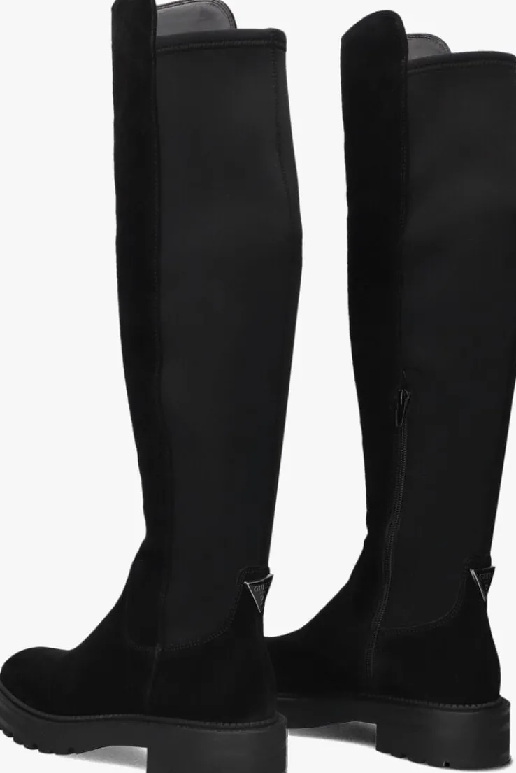 Het bekende, Amerikaanse merk GUESS ontstond in 1981 en staat symbool voor een luxueuze, jeugdige, sexy en avontuurlijke levensstijl. Het merk maakt trendy items die jouw outfit de juiste touch geven. Deze lange laars CARMEN doet dat zeker! Dit model is uitgevoerd in zwart suéde met textiel en heeft een iets hogere schacht aan de voorkant. Opvallende details zijn het merkembleem op enkelhoogte, de afwerking van reliëf op de zoolrand en de dubbele stiksels. Je trekt de laars eenvoudig aan door de achterkant van textiel en de ritssluiting aan de onderkant. De voering is ook van textiel en de laars heeft een vast, leren voetbed met comfortabele demping. Dit model heeft een schachthoogte van 45 centimeter (gemeten bij maat 37) en is door de verhoging van de schacht 3,5 centimeter hoger aan de voorkant. De chunky, rubberen zool heeft een grof profiel voor veel grip, is onder de voorvoet 2,5 centimeter hoog en heeft een hakhoogte van 4 centimeter. Draag deze laarzen onder een jurk of korte rok en je bent helemaal on trend!