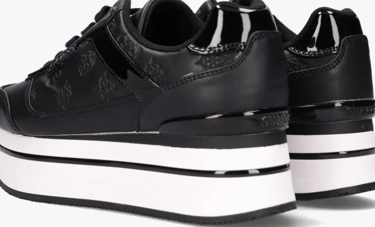 Voeg een trendy-sporty uitstraling toe aan je outfit met deze zwarte platformsneaker HANSIN uit de collectie van GUESS! Het bovenwerk is uitgevoerd in lederlook en heeft een merkopdrukkenprint op de zijpanden en een contrasterende witte zool met zwarte accentstrepen. Merkopdrukken zijn te vinden op de tong, zijkant en hiel en de lak afwerking zorgt voor een shiny finishing touch. Het binnenwerk heeft een voering van mesh met een uitneembaar, dempend voetbed. De lichtgewicht platformzool met zwarte lijnen en zwarte hielstabilisator is 4 centimeter dik onder de voorvoet en heeft een dikte van 6 centimeter onder de hiel. Draag deze toffe sneaker relaxed onder een jeans of nonchalant onder een rokje of jurkje.