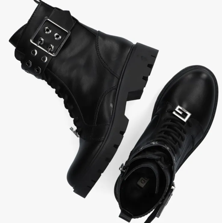 Voeg een beetje glam toe aan je outfit met deze zwarte veterboots RITER uit de collectie van GUESS!Het bovenwerk is uitgevoerd in glad lederlook met opvallende details. Zo heeft de laars een metallic merkembleem op de veters en een gave leatherlook band met metallic gesp en ringen over de vetersluiting heen lopen. De laars heeft ook een handige ritssluiting en samen met de aantreklus is het super makkelijk om ‘m aan en uit te trekken. Extra handig zijn de veters waardoor je de laars gemakkelijk passend kan maken aan je voet. Het binnenwerk heeft een zachte suèdelook voeringmet een vast voetbed. De opvallende zool heeft diepe groeven voor superveel grip. Onder de voorvoet is de laars bijna 2 centimeter hoog en de hakhoogte is 4 centimeter.Draag deze trendy boots relaxedonder een jeans of nonchalant onder een rokje of jurkje.