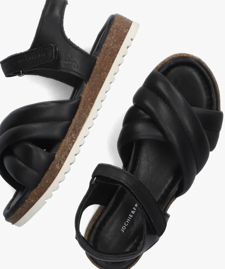 Straal met deze sandalen BLOSSOM van het merk JOCHIE & FREAKS! Dit model is gemaakt van zwart leer en heeft twee gekruiste, gewatteerde banden over de voorvoet. Om de enkel zitten dunne bandjes en het bandje om de hiel is ook gewatteerd voor extra comfort. Het enkelbandje heeft een klittenbandsluiting om het sandaaltje goed passend te maken. Het hielstukje is opgevuld voor nog meer comfort. De sandaal is leer gevoerd en het voetbed heeft een zachte demping. De bruine zool van kurk en de witte zool van rubber met kartelprofiel geeft dit model een stoere look en super veel grip!