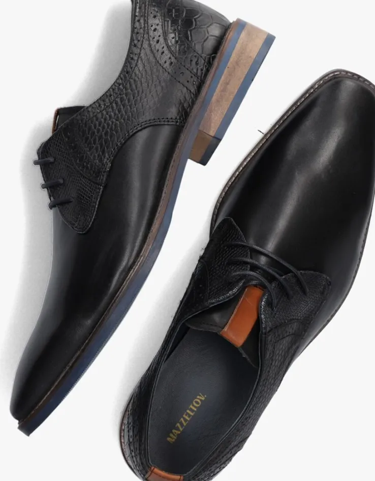 MAZZELTOV. is hét merk voor de modebewuste man die er graag goed uitziet, de trends volgt en zijn stijlen op verschillende manieren combineert. In de collectie vind je diverse invloeden van klassiek tot retro en van stoer tot sportief, er is vast wel een model wat jouw aanspreekt. Deze zwarte nette schoen 3967 is uitgevoerd in hoogwaardig leer en is afgewerkt meteen opvallende reptielenprint en fraaie brogue perforaties op de zijkant. De schoen sluit door middel van een klassieke derby-sluitingmet ronde veters van gewaxt katoen. De print op het bovenwerk zorgt voor een unieke look en trendy uitstraling. Dit model is leer gevoerd en heeft een comfortabel vast voetbed. De rubberen loopzool heeft een mooie blauwe kleur en dankzij het gripvaste profiel ervaar je veel grip en stabiliteitop verschillende ondergronden. De perfecteschoen voor een stijlvolle look op ieder moment! Combineer ‘m onder je nette pak of juist onder heel casual met een jeans.