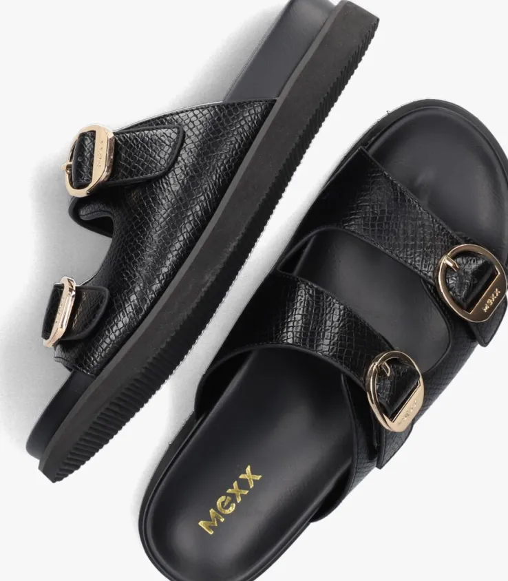 Stap in stijl met de NIRKEN slippers van MEXX. Deze zwarte slippers met gespen zijn gemaakt van leatherlook materiaal met een reptielenprint. De voering bestaat ook uit leatherlook. De rubberen zool zorgen voor comfort en een trendy uitstraling. Perfect voor een dagje strand of een zomerse wandeling in de stad. Combineer de slippers met een luchtige zomerjurk of een trendy short en je bent klaar om te stralen.