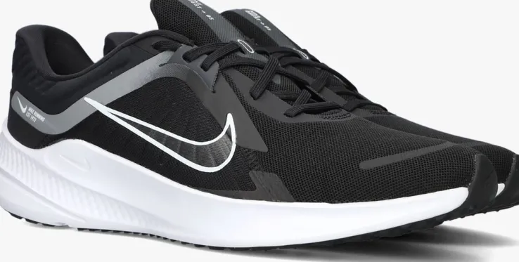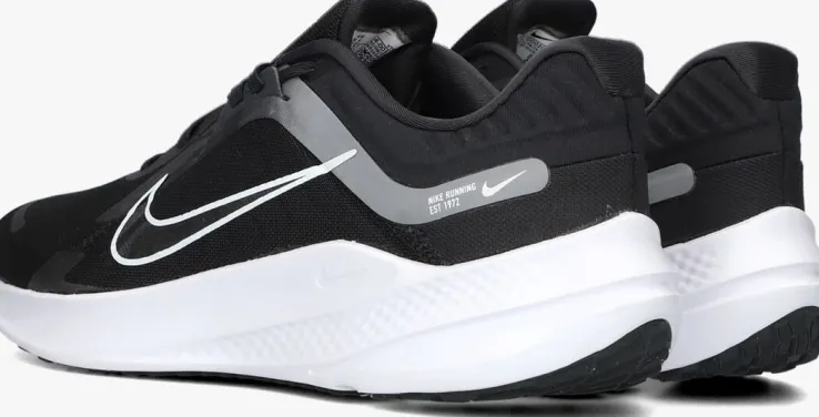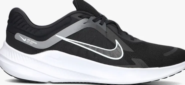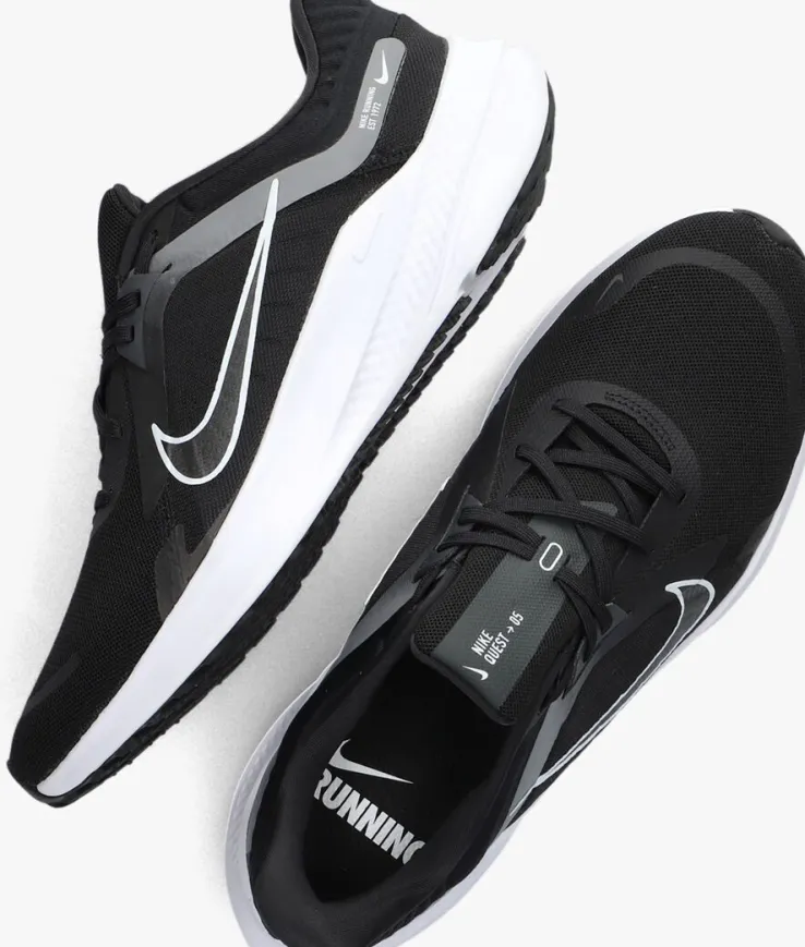 Deze lage sneaker QUEST 5 HEREN van NIKE is een sportief exemplaar en vooral super comfortabel! Dit model heeft een bovenwerk van zwart mesh textiel in combinatie met geweven textiel en is afgewerkt met rubberen en grijze accenten. De schoen is voorzien van verschillende witte merkopdrukken. De voering bestaat uit mesh textiel en het voetbed met comfortabele demping is uitneembaar. Extra opvallend aan deze sneaker is de witte, rubberen zool. Deze zool is licht van gewicht, super soepel en loopt naar achteren op tot een hoogte van 4 centimeter. De zwarte loopzool biedt een uitstekende grip, steun en stabiliteit tijdens je dagelijkse bezigheden. Dit model staat je altijd goed!