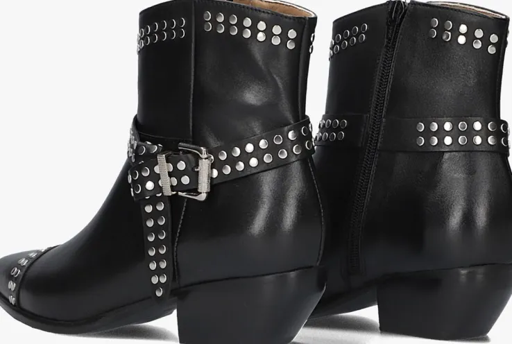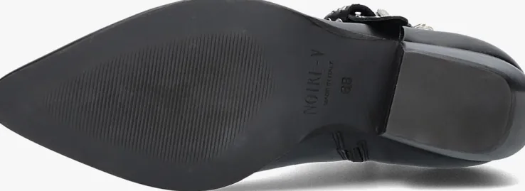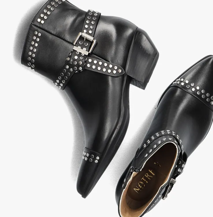 Stap stijlvol de dag in met deze zwarte leren enkellaarzen van NOTRE-V. Met hun puntige neus en blokhak geven ze jouw outfit een trendy touch. Opvallend zijn de zilverkleurige, platte studs bij de voorvoet, enkelrand en op de band van de siergesp. De rits zorgt voor een gemakkelijke sluiting. De binnenkant is gemaakt van leer, wat zorgt voor een comfortabele pasvorm. De rubberen zool biedt grip en stabiliteit en de hak heeft een houtlook. Combineer deze enkellaarzen met een strakke jeans en een oversized blouse voor een casual-chique look. Of draag ze onder een little black dress voor een elegante uitstraling. Met de AS186 ben jij klaar om te stralen!