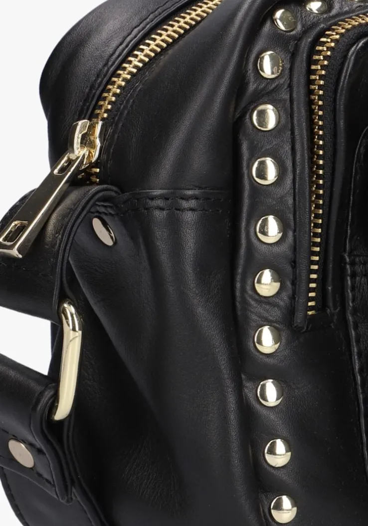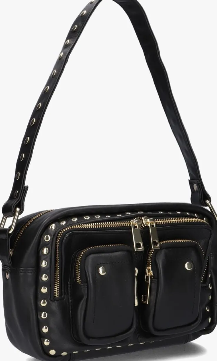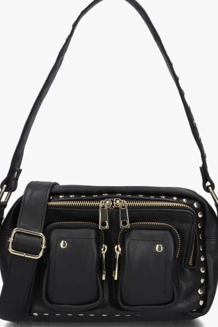 Deze schoudertas ELLIE PURE DISCO komt uit de collectie van het merk Núnoo en is een echte musthave! De zwarte tas is uitgewerkt in hoogwaardig leer en heeft goudkleurige details. De voorzijde is voorzien van één groot ritsvak en daarop zijn twee ritsvakjes gestikt, je kunt hier makkelijk je sleutels en lipgloss in doen. De rand is voorzien van goudkleurige studs, deze studs ook terug te vinden op het vaste hengsel. Het hoofdvak wordt ook afgesloten met een ritssluiting en de voering bestaat uit textiel. Je hebt aan ruimte geen gebrek, want in het hoofdvak zit ook nog één ritsvak en één steekvak. Met het vaste hengsel kan je de tas goed over je schouder dragen, maar je kunt ‘m ook crossbody dragen, door het brede hengsel aan de tas te bevestigen. Wij zijn fan! Jij ook? Afmetingen: 24 x 9 x 15 centimeter( lengte x breedte x hoogte).