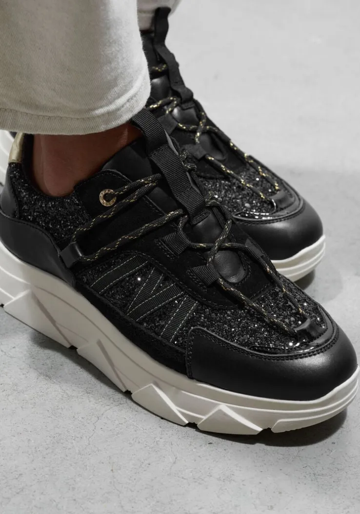 Stap stijlvol de deur uit met de KADY FAT 429 lage sneakers van TANGO. Deze zwarte leren sneakers met ronde neus, glitter en goudkleurige panelen en ronde vetersluiting zijn perfect voor een dagje shoppen of een ontspannen wandeling in het park. De leren binnenkant zorgt voor ultiem comfort, terwijl de stevige witte rubberen zool je de hele dag door ondersteunt. Combineer deze veelzijdige sneakers met een strakke jeans en een casual blouse voor een moeiteloze, trendy look. Of draag ze onder een zomerse jurk voor een speelse twist. Met de KADY FAT 429 ben je altijd klaar voor elke gelegenheid.