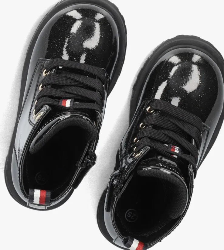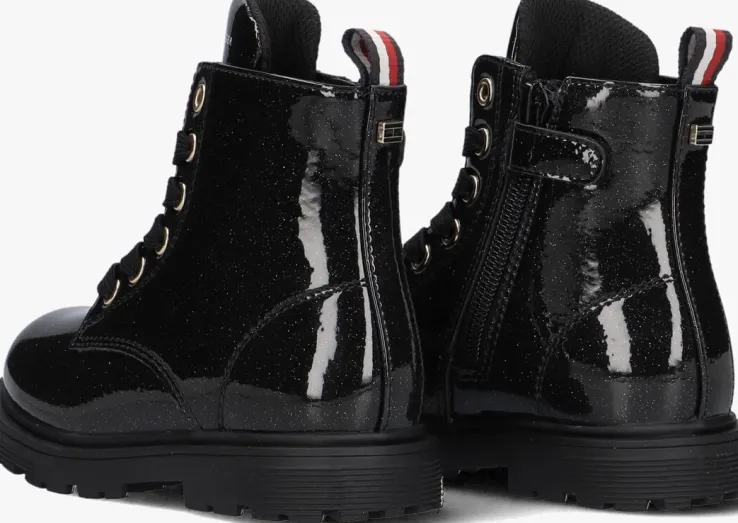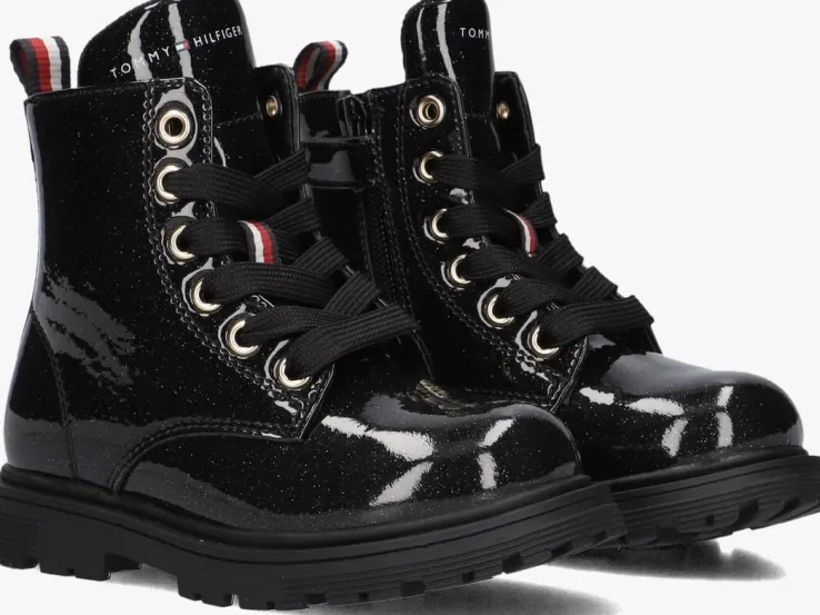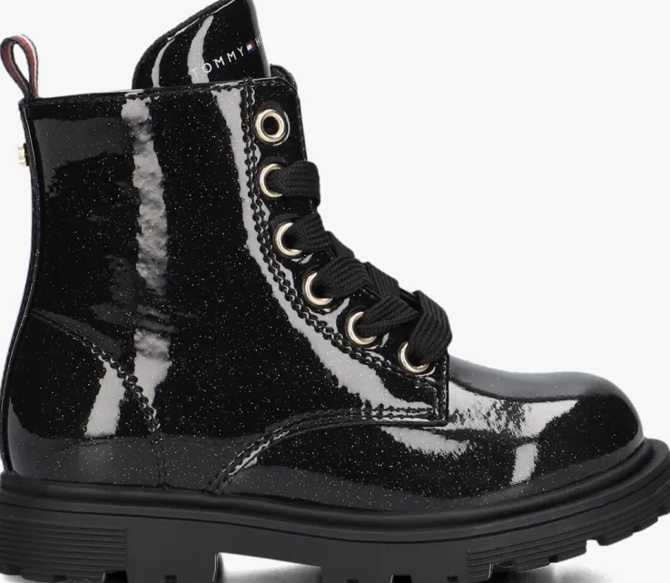 Maak kennis met de stoere veterboots 33564 van TOMMY HILFIGER. Deze zwarte boots zijn perfect voor avontuurlijke meisjes die houden van een trendy look. Het bovenwerk heeft een laklook met een subtiele glitter. Extra tof zijn de goudkleurige veterringen, het logo op de tong en de textielen aantreklus. De stevige zool en comfortabele pasvorm zorgen ervoor dat je de hele dag door kunt gaan. Met deze boots aan je voeten ben je altijd klaar voor een nieuw avontuur!