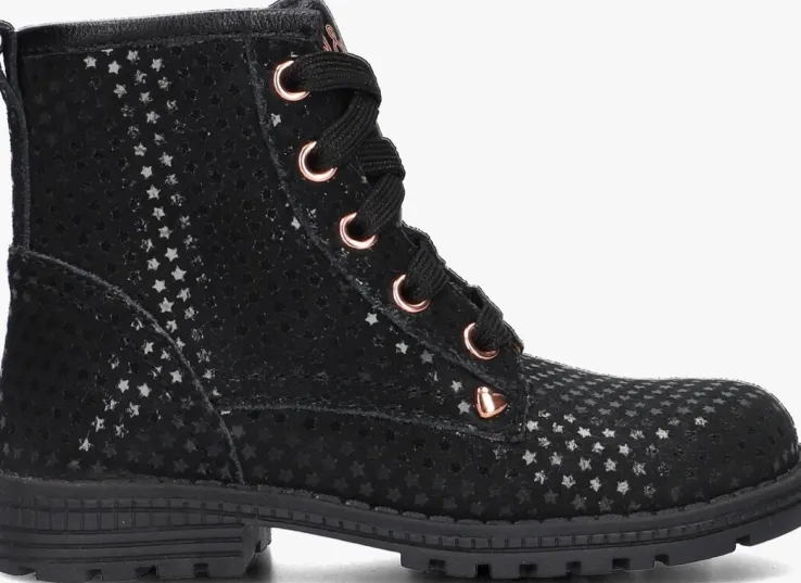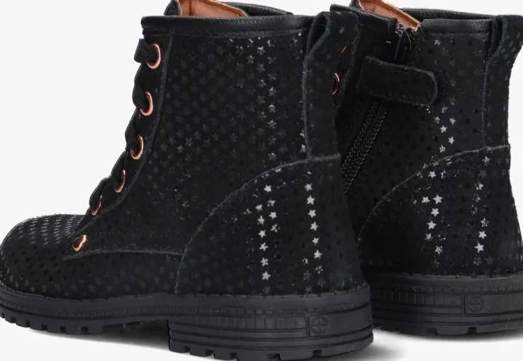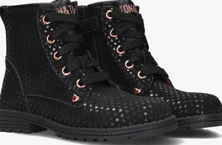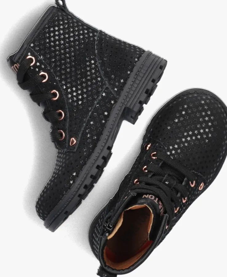 Deze stoere veterbootsHEDVIG komen uit de collectie van het nieuwe merkTON & TON. Een kind moet kind kunnen zijn en daar horen nu eenmaal fijne schoenen bij die goed zitten, stevig zijn en waar ze goed mee kunnen bewegen! Uiteraard wordt er ingespeeld op trends en veel aandacht besteed aan de kwaliteit en details, dat zie je dan ook terug. Dit model is aan de buitenkant gemaakt van zwart suède met toffe pixelprint van sterren voor een unieke touch. Het merkembleem op de tong, de veterringen en de hartvormige stud hebben een roségouden kleur. Dankzij de handige ritssluiting aan de zijkant van de boot ervaar je veel gemak met het aan- en uittrekken. Deze boot is leer gevoerd en beschikt over een uitneembaar voetbed. De rubberen zool heeft een grof profiel en zorgt daardoor voor veel grip, steun en stabiliteit. Je draagt deze boot onder eenjeans of juist onder een jurkje voor een stoere touch!