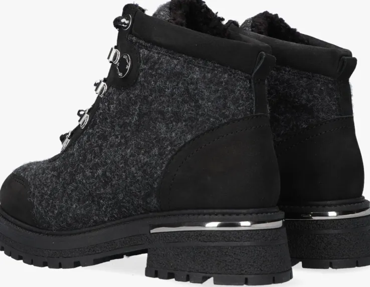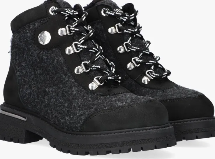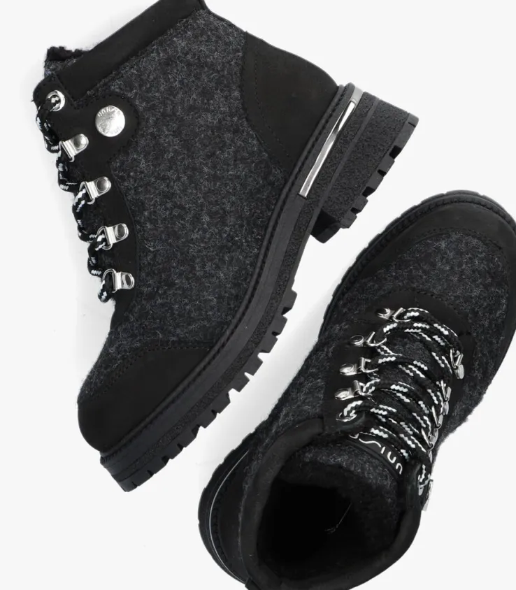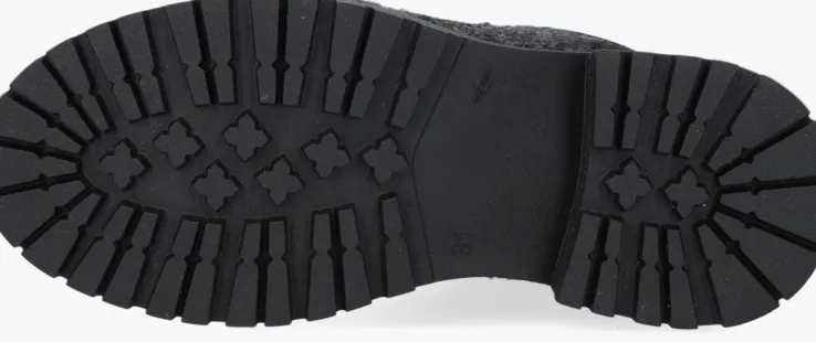 Deze stoere enkelboot SENTO van het merk UNISA is uitgevoerd in gemêleerd zwart vilt textiel met panelen van nubuckleer langs de gevoerde enkelkraag, de stevige hielcap en op de veterklep. Toffe details zijn de tweekleurige veters met zilverkleurige D-veterringen, de zilverkleurige merkknoop op de schacht, de versteviging van nubuckleer rondom de neus en de zilverkleurige hielinzet. De dikke rubberen zool met grof profiel zorgt voor een stoere uitstraling en geeft je kleine meid veel grip tijdens het rennen en spelen.De schoen is volledig gevoerd met zacht wol voor warme voeten tijdens koude winterse dagen en beschikt over een vast voetbed. De zool is 2 centimeter dik onder de voorvoet en heeft een hoogte van bijna 4 centimeter. Ondanks zijn dikte is de zool toch heel flexibel en licht van gewicht.