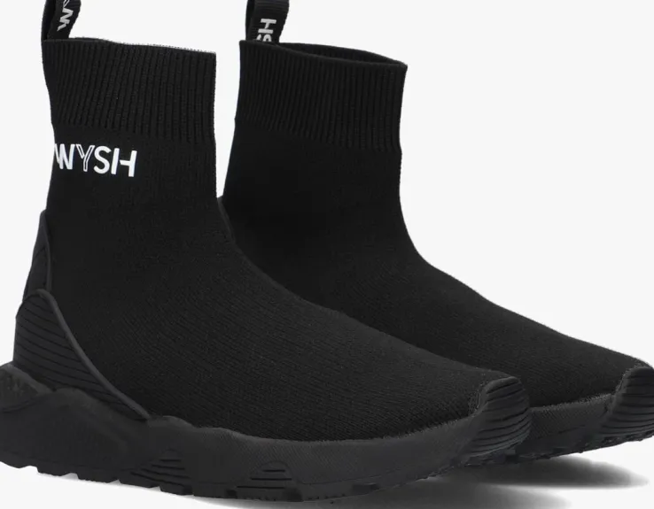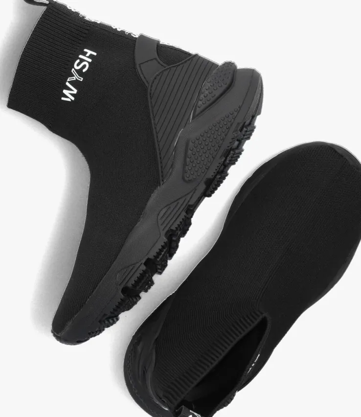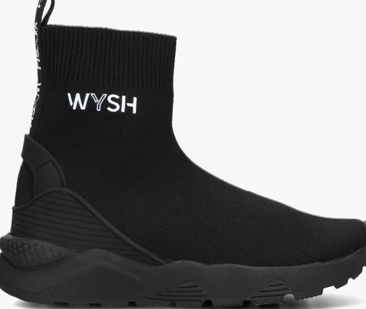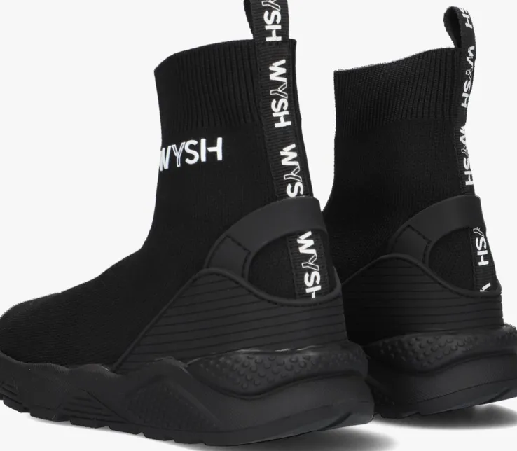 Hétnieuweschoenenmerkvoor coole kids, WYSH, staat voorWearYourSHoesen is vooreigenwijze types diehuneigenstijl volgen.Oftewel, doe je ding! Draagopieder momentde schoenen die jij wilt,opiederemanierdiejijtofvindt.De trendy modellen zijn uitgevoerd in hoogwaardige materialen en zijn met zorg ontworpen voor snel groeiende voeten. Deze hoge soksneaker JAIME is uitgevoerd in zwart gebreid textiel en heeft speelse accenten zoals de rubberen hielinzet met aantreklus, de textiel logotape op de achterkant en de witte rubberen merkopdruk op de zijkant. De elastische sok zorgt ervoor dat je deze schoen heel eenvoudig aan- en uittrekt en het binnenwerk heeft een lederlook voering met een uitneembaar voetbed. Op de zoolrand zijn chunky vormen te vinden en de rubberen zool zorgt voor een stoere look met een stevige grip. Durf eigenwijs te zijn met WYSH!