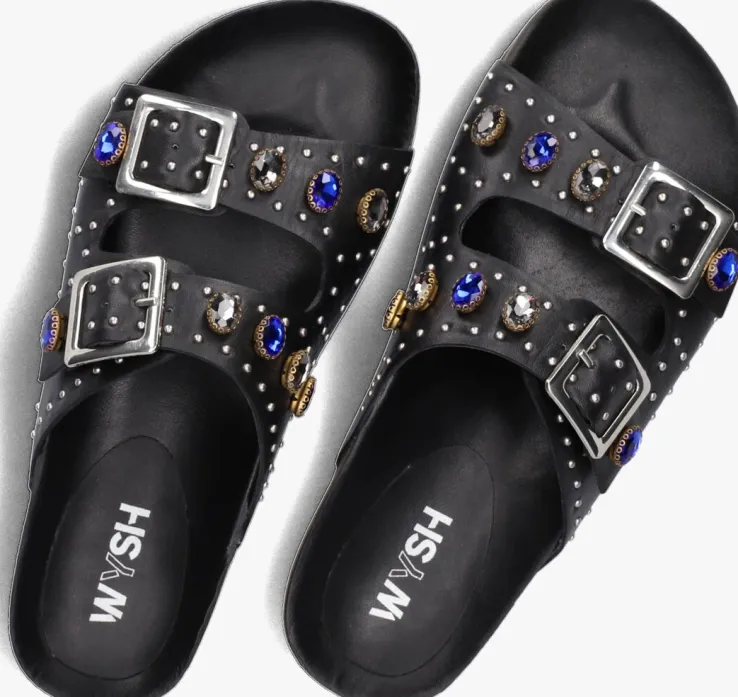 Hétnieuweschoenenmerkvoor coole kids, WYSH, staat voorWearYourSHoesen is vooreigenwijze types diehuneigenstijl volgen.Oftewel, doe je ding! Draagopieder momentde schoenen die jij wil,opiederemanierdiejijtofvindt.Deze trendy slipper is gemaakt van hoogwaardig materialen en zijn met zorg ontworpen voor snel groeiende voeten.Deze zwarte JOSEPHINE slipper is uitgevoerd in soepel leer met opvallende zilverkleurige gespjes, ronde bolstuds en stoere krasstenen in een diep blauwe en grijze kleur. Het binnenwerk heeft een leren voering en de kurken tussenzool gaat zich naar verloop van tijd vormen naar de voeten van jouw kind, voor extra loopcomfort. De zwarte rubberen zool zorgt voor een stoere look, heeft golvende vormen en een gripvast profiel.Durf eigenwijs te zijn met WYSH!